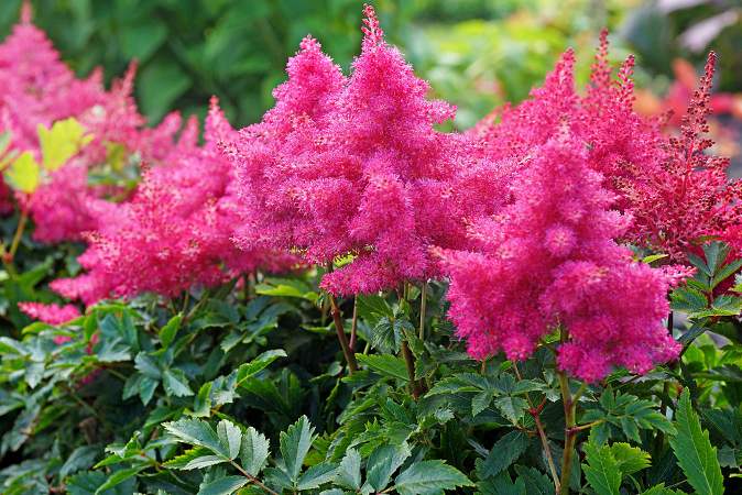 Сроки цветения различных сортов астильбы — с конца июня до сентября, можно подобрать такую коллекцию, чтобы любоваться цветением почти все лето. Оптимальная освещенность — разреженная тень или затенение в самое жаркое время дня, многие астильбы прекрасно чувствуют себя и на открытом солнце.