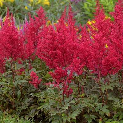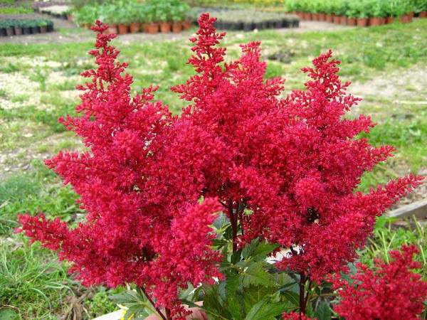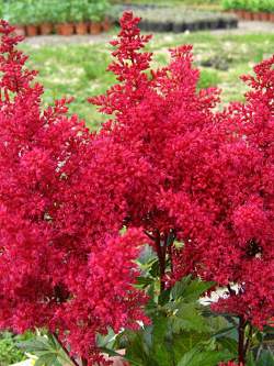 Астильба Red Sentinel (Ред Сентинел). В группе сортов с красной окраской этот сорт самый яркий и эффектный! Соцветия ажурные, легкие, воздушные, парят над кустом, очень яркого темно-красного цвета. Обильное цветение. Листва декоративная, блестящая. Куст мощный, с обильным цветением. Можно высаживать группами с кустарниками.