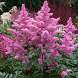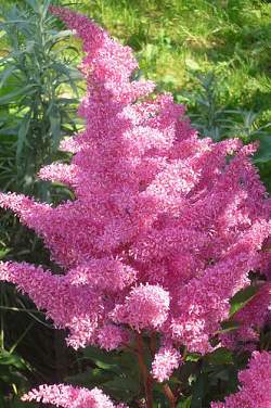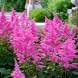 Астильба Rhythm and Blues (Ритм энд Блюз). Листья крупные, тёмно-зеленые, блестящие. Цветки малиново-розовые, в плотных и пышных пирамидальных метелках. Цветение наступает в конце июля.