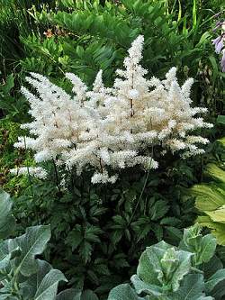 Астильба Rock And Roll (Рок энд Ролл). Соцветия высокие, ажурные, пушистые, белые, цветоносы бордовые. Цветение очень продолжительное и обильное.