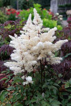 Соцветия высокие, ажурные, пушистые, белые, цветоносы бордовые. Цветение очень продолжительное и обильное.