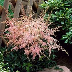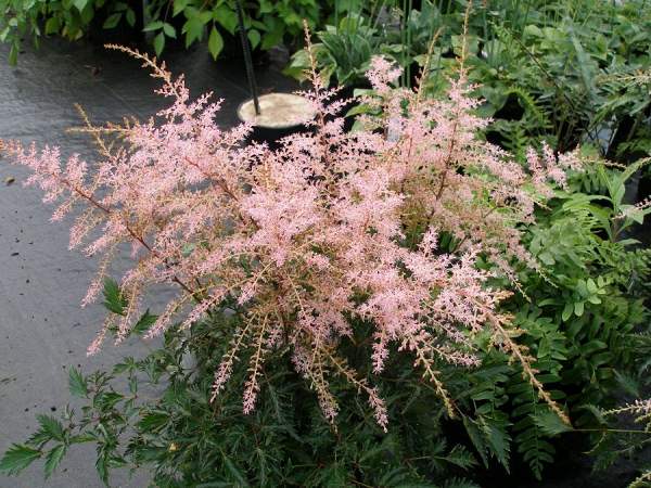 Астильба Sprite (Спрайт). Очень компактная, соцветия — ажурные поникающие метелки светло-розового цвета. Листья темно-зеленые. Форма куста фонтанообразная. Лучше растет в ажурной тени. Высота в цвету 30 см.
