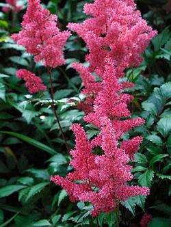 Астильба Veronica Klose (Вероника Клозе). Сорт невысокий, до 45 см. Цветки пушистые, малиново-красные, собраны в пирамидальные соцветия.