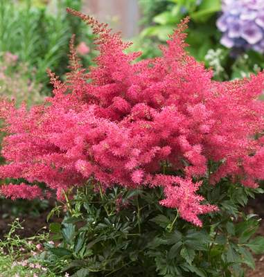 Астильба Younique Cerise (Юник Сериз). Лучшая астильба из серии Younique. Соцветия крупные, необычайно пушистые, как нежное облако, совершенно непередаваемого цвета — светящиеся, розовато-коралловые с брусничным оттенком, переливающиеся. Это звезда, которую хочется видеть на переднем плане цветника.