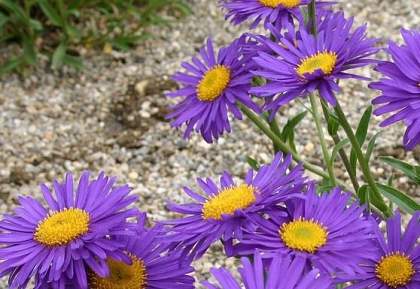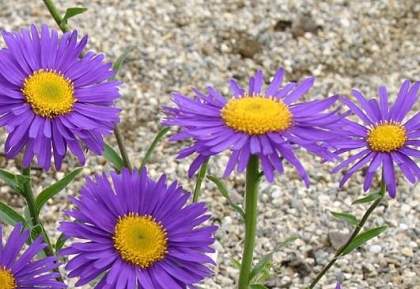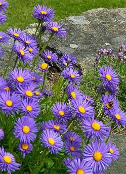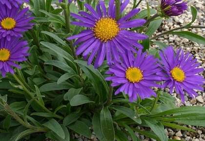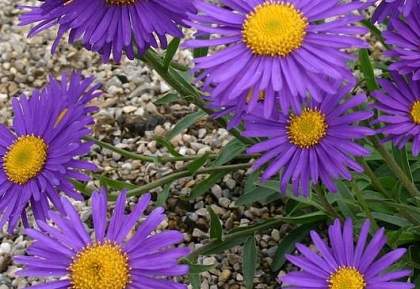 Астра альпийская Dunkle Schone (Данкл Шон). Соцветия крупные, ярко-сине-фиолетовые, с желтой серединкой. Высота кустиков с цветоносами 15-20 см, цветение обильное в начале июня.