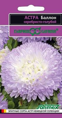 Астра Баллон серебристо-голубой 0,1 г. Легендарная серия астр Balloon (Воздушный шар) превосходит все известные сорта по степени махровости и плотности шаровидных соцветий. Растение пирамидальной формы, высотой 50-60 см с прочными цветоносами. На одном растении формируется до 6-8 соцветий серебристо-голубого оттенка, диаметром 9-13 см. Выращивают, чаще всего, рассадным способом.