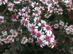 Астра бокоцветная Prince (Принц). Формирует довольно высокий куст, до 120 см. Мелкие овальные листья темного серо-зеленого цвета придают растению необычный вид. Мелкие белые цветки с насыщенно-малиновой серединой собраны в гроздья. Предпочитает плодородные земли. Используется при групповых посадках. Долго стоит в срезке.