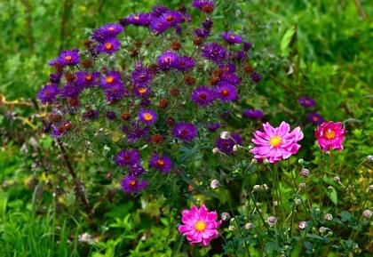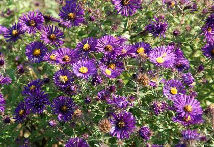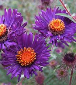 Астра Constance (Констанс). Куст достаточно высокий, достигает 150-180 см. Стебли прочные, ветвистые, густо облиственные. Листья ланцетные. Соцветие 3,5 см в диаметре, темно-лиловые, трубчатые — оранжевые или желтые. Соцветия многочисленные, собраны в кисти. Цветет в сентябре-октябре 35 дней.
