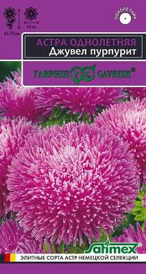 Астра Джувел Пурпурит однолетняя (игольчато-коготковая). Огромные игольчато-коготковые, практически шаровидные соцветия до 14 см. Растение пирамидальной формы, высотой 65-75 см с прочными цветоносами. На одном растении формируется до 10 двухцветных лилово-розовых соцветий. Выращивают, чаще всего, рассадным способом. Семена высевают в марте-апреле, пикируют с развитием первой пары настоящих листочков по схеме 5х5 см, в открытый грунт рассаду высаживают с середины мая до начала июня. Возможен посев семян в открытый грунт ранней весной или под зиму с последующим мульчированием торфом или опилками. Эффектная серия Джувел привлекает покупателей крупными соцветиями роскошной формы и отличными срезочными качествами. Прекрасно подойдет для оформления цветников.