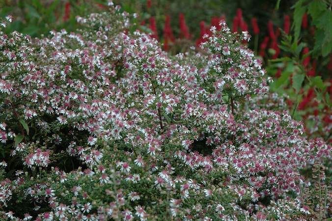 Астра бокоцветная Horizontalis (Хоризонталис). Образует шикарный куст, усыпанный мелкими цветками. Многолетник высотой 75-100 см. Цветки белые с красноватым центром. Цветение обильное, в сентябре. Листья маленькие, узкие, тёмно-зелёные. Стебли тёмно-фиолетовые, горизонтальные, разветвлённые.