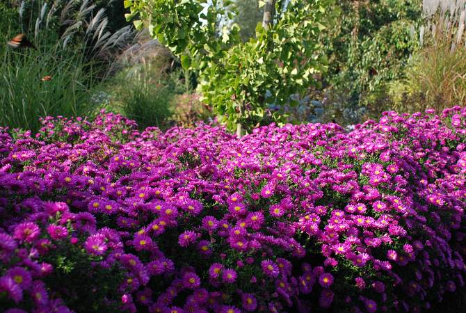 Астра кустарниковая Kassel (Кассел). Компактный бордюрный сорт с крупными цветами. Образует плотный шарообразный кустик. Цветки ярко-малиновые. Цветение в августе-октябре.