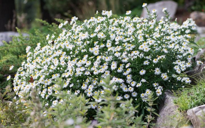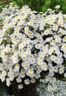 Астра кустарниковая Kristina (Кристина). Низкорослая подушковидная астра. Высота до 40 см. Куст пышный, округлый, побеги сильно ветвящиеся, цветение обильное. Цветки белые, появляются в августе. Цветение продолжительное, до октября. Неприхотлива, полностью зимостойка в средней полосе.