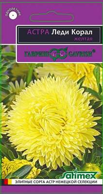 Астра Леди Корал желтая однолетняя (розовидная). Роскошная серия высоких астр (60-70 см) с пирамидальной формой куста. Многочисленные плотно-махровые розовидные соцветия диаметром 10-12 см на прочных цветоносах долго сохраняют свежесть в цветниках и букетах. Язычковые цветки золотисто-желтого оттенка. Для выращивания подходят хорошо освещенные участки с плодородной суглинистой или супесчаной почвой. Выращивают, чаще всего, рассадным способом. Семена высевают в марте-апреле, пикируют с развитием первой пары настоящих листочков по схеме 5х5 см, в открытый грунт рассаду высаживают с середины мая до начала июня. Возможен посев семян в открытый грунт ранней весной или под зиму с последующим мульчированием торфом или опилками. Сорта серии Леди Корал имеют высокую устойчивость к фузариозу и благодаря большому количеству соцветий на одном растении долго сохраняют декоративность в любых погодных условиях. Лучшая серия для профессионального выращивания на срезку.
