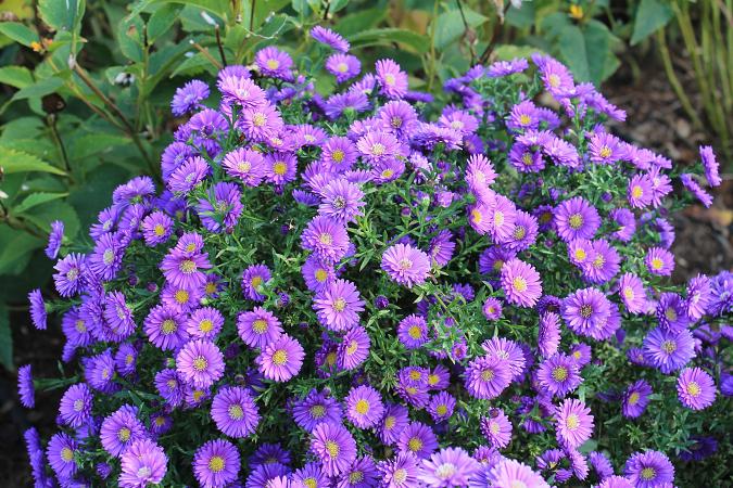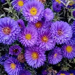 Астра кустарниковая Magic Blue (Мэджик Блу). Компактная, неприхотливая, обильно цветет. Куст округлый, высота 40 см. Цветки сиреневые, почти синие, махровые. Цветет с конца сентября. Посадка на солнце. Великолепное растение для бордюров и смешанных цветников. Чтобы создать яркую позднеосеннюю композицию, можно сажать вместе с золотарником сорта Patio.