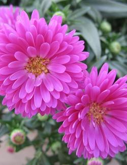 Астра Magic Pink (Мэджик Пинк). Невысокая астра, образует шаровидный куст высотой до 40 см. Цветет обильно, полностью закрывая цветками куст. Цветки яркие, насыщенно-розовые, привлекательные, полумахровые. Время цветения август-сентябрь. По факту цветет до заморозков.