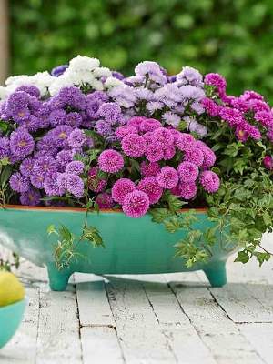 Астра многолетняя Marie Ballard (Мари Баллард). Крупные, почти шаровидные цветы с многочисленными тонкими лепестками окрашены в живописный сиреневый цвет, очень чистый и яркий. Растет компактно, неприхотлива. Используется как в одиночных, так и в групповых посадках, где выглядит более эффектно. Одна из самых популярных осенних астр.