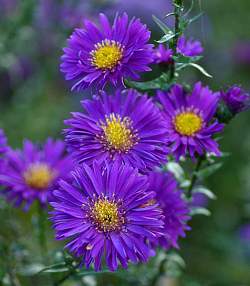 Астра Pride of Colwall (Прайд оф Колвэл). Новый сорт астры новобельгийской. Высота 60-70 см, цвет яркий, фиолетовый. Красиво смотрится контрастная желтая серединка. Куст разветвленный, пышный, не требует подвязки. Цветки крупные! Цветет непрерывно с августа до заморозков.