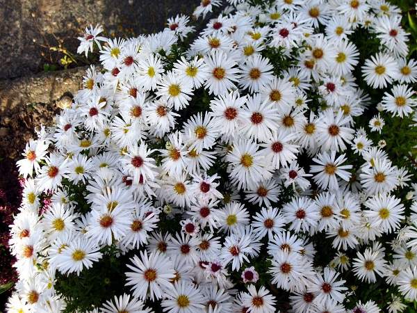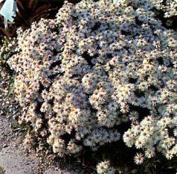 Астра кустарниковая Schneekissen (Шнеекиссен). Многолетнее травянистое растение с прямостоячими сильно ветвистыми стеблями до 30 см высотой, образует широкий плотный полушаровидный куст. Листья сидячие, ланцетные, темно-зеленые, многочисленные. Соцветия около 2 см, язычки белые. Цветет обильно в августе-сентябре.