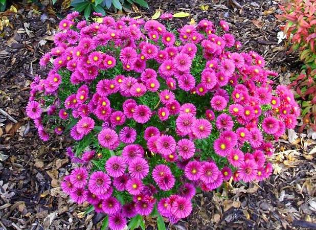 Астра Starlight (Старлайт). Плотный куст высотой до 40 см. Цветки ярко-малиновые, до 5 см в диаметре. Цветение в августе-сентябре.