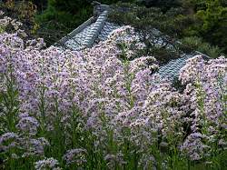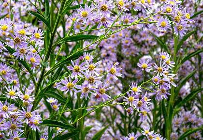 Астра татарская. Многолетнее корневищное растение до 1,5 м высотой. Прикорневые листья — длинночерешковые, ложковидные; стеблевые — черешковые, обратнояйцевидные. Цветки сиреневые, собраны в корзинки: краевые — женские, язычковые; срединные — желтые. Корзинки собраны в щиток. Цветет с июля по сентябрь.