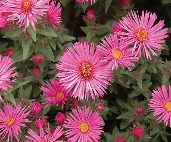 Астра кустарниковая Vibrant Dome (Вибрант Доум). Образует куполообразный кустик высотой 50 см и шириной 60-70 см. Цветки яркие малиново-розовые с жёлтой серединкой. Цветение в августе-сентябре.