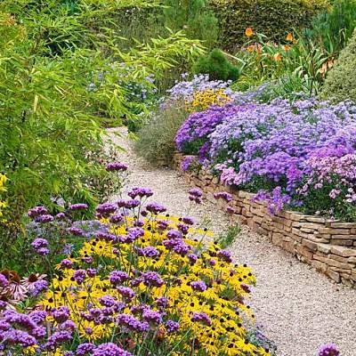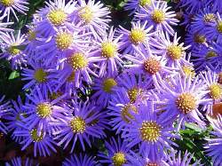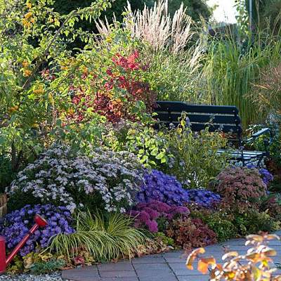 Астра кустарниковая Zwergenhimmel (Цвергенхиммель) на подпорной стенке с другими компактными осенними астрами.