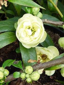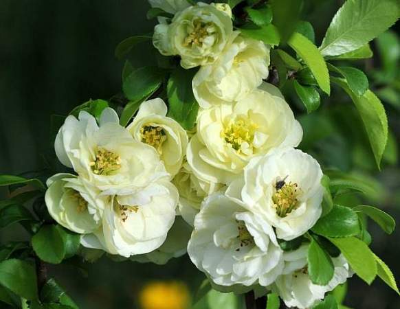 Айва Kinshiden (Киншиден). Кустарник с декоративными кремовыми полу махровыми цветками и очень ароматными плодами. Сорт рекомендуется для всех видов участков. Листья продолговатые, овальные, с пильчатым краем, длинной 5-10 см. Цветки диаметром 3-4 см, очень декоративные, кремовые, хороший медонос.
