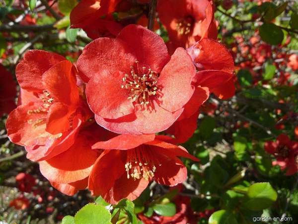 Айва великолепная Nicoline (Николайн). Красивоцветущий кустарник со съедобными плодами. Высота и диаметр куста около 100 см. Цветет восхитительно, обильно и продолжительно, в течение 2-3 недель. Цветки алые, до 5 см в диаметре, появляются в мае до роспуска листьев. Плоды некрупные, ароматные, созревают в октябре, отлично хранятся в течение зимы. Их используют для заготовок.