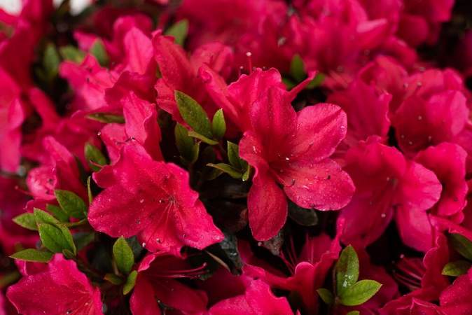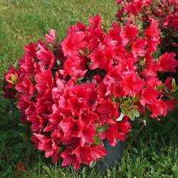 Азалия японская Arabesk (Арабеск). Привлекательный сорт японской азалии с большими темно-красными цветами. Обильно цветет с середины до конца мая. Вечнозеленая листва темно-зеленая, осенью и зимой приобретает бордовые и красные оттенки, до начала цветения снова становится зеленой. Азалия Арабеск растет медленно, образуя опрятный и компактный куст, который останется плотным даже без обрезки.