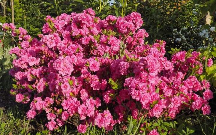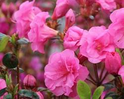 Азалия Babushka (Бабушка). Низкий густой кустарник высотой до 30-40 сантиметров и шириной около 50 сантиметров. Крона компактная. Цветки розового цвета, махровые состоят из 14 лепестков, плотно расположенных в 3 ряда.