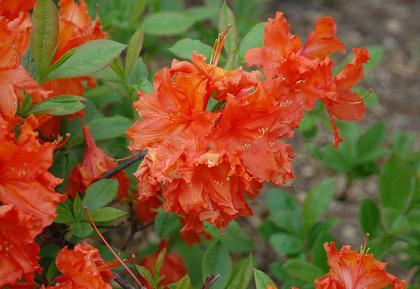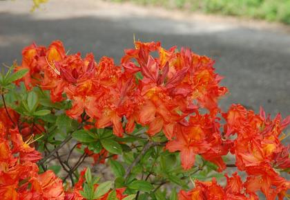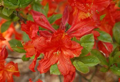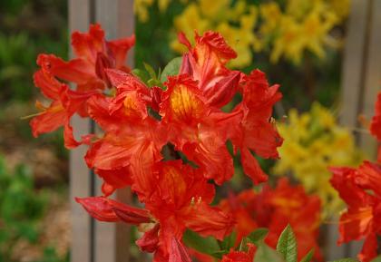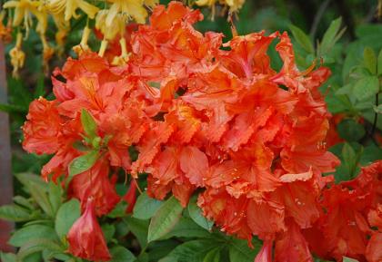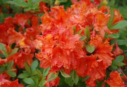 Азалии — очаровательные кустарники с мелкими листьями. Весной, во время цветения, раскрывшиеся бутоны азалии полностью скрывают листья и окрашивают весь кустарник в самые разные оттенки розового, оранжевого, красного, сиреневого и желтого. Осенняя окраска этого вида (рододендрон желтый) совершенно феерическая, листья окрашиваются в огненно-оранжевые, красные, пурпурно-фиолетовые тона.