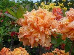 Азалия Barbecue (Барбекю) цветет ароматными, лососево-розовыми с оранжевым пятном, полумахровыми цветками. Цветки 6-8 см, собранные в кисти по 8 шт. Цветение конец мая — июнь.