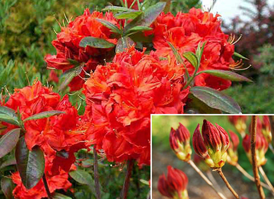 Азалия Fireball (Фаеболл). Цветки махровые, 3-4 см диаметром, алые, ароматные. Высокая морозостойкость, до -29°С и очень хорошая зимостойкость. Неприхотливый сорт.