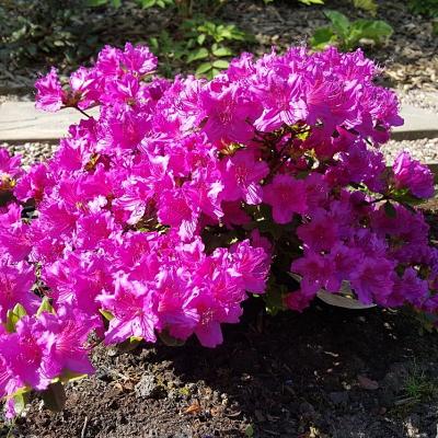 Азалия Geisha Purple (Гейша Пёпл). Компактный, медленно растущий, хорошо разветвленный кустарник. Цветение обильное и невероятно зрелищное, цветки воронкообразные ярко-фиолетового цвета. Листья темно-зеленые, осенью становятся темно-бордовыми, зимующие. Предпочитает безветренные места без прямых солнечных лучей.