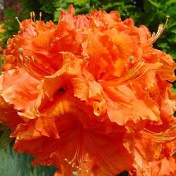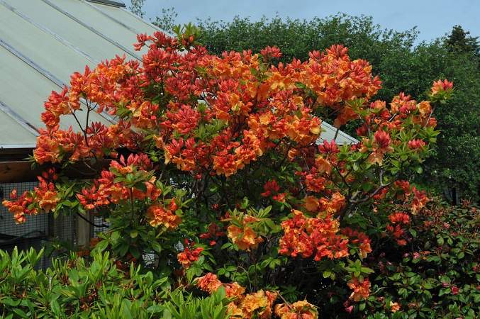 Азалия Gibraltar (Гибралтар). Густорастущий кустарник высотой 1,5 метра. Листья блестящие, темно-зеленые. Цветет очень буйно, цветы от оранжевых до красно-оранжевых, с загнутыми лепестками. Желательно удалять отцветшие соцветия, а также мульчирование. Обильный полив перед зимовкой. Место посадки солнце или полутень.