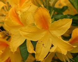 Азалия Goldtopas (Голдтопаз). Цветки крупные, ярко-желтые с янтарным пятнышком на верхнем лепестке. Высота кустарника 150 см. Обильное цветение. Морозостойкий сорт, до -27 °С. Цветение в июне в течение трёх недель. Листва тёмно-зелёная, осенью красивая — красновато-оранжевая.