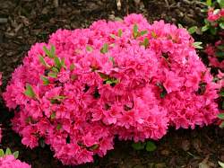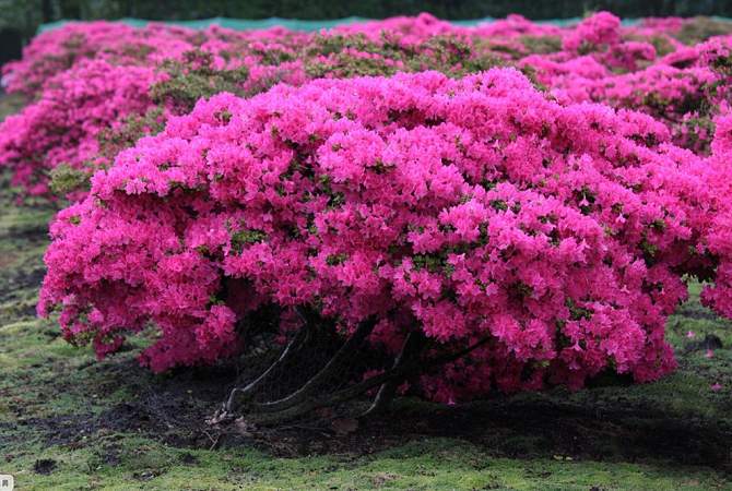 Азалия Kermesina (Кермезина). Цветки насыщенного розового цвета, собраны в соцветия. Во время цветения листьев на растении не видно. Высота куста не более 60 см. Диаметр — 90 см. Цветет в мае-июне.