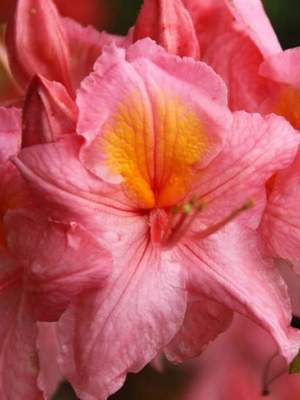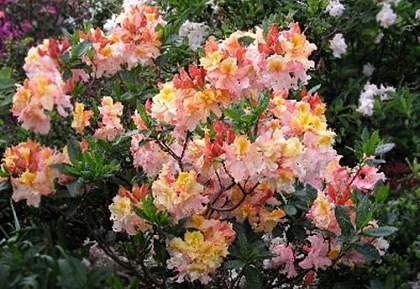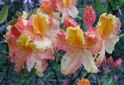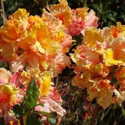Азалия Mayaro (Майаро). Нэп-хилл. Сорт невероятно живописный. Цветки разноцветные, кремово-розово-лососевые, два лепестка темные, верхний лепесток оранжевый. Бутоны и цветки снаружи розовые, более темные. Края лепестков сильно волнистые (гофрированные). Цветки душистые, крупные, диаметром до 11 см, собранные в соцветия по 10 штук. Сорт устойчив к мучнистой росе. Морозоустойчивость до -23 °С.