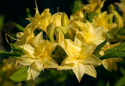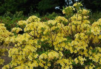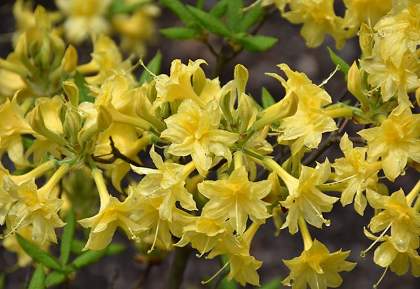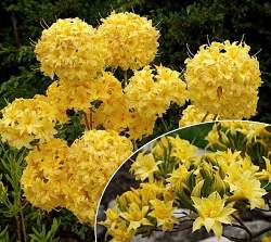 Азалия Narcissiflora (Нарциссифлора). Очень морозостойкий сорт. Листопадный кустарник с густой широкой кроной. Высота 1,8 м, диаметр кроны 1,6 м. Цветки светло-желтые, душистые, диаметром около 3 см, полумахровые.