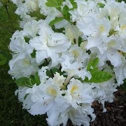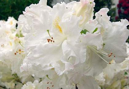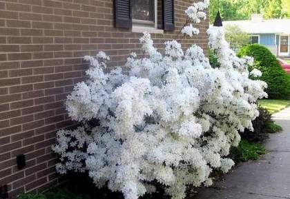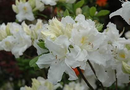 Азалия Oxydol (Оксидол)/Рододендрон желтый Oxydol (Оксидол). Прямостоячий листопадный кустарник с густой кроной. Молодые листья коричневато-красные, несколько бронзовеют к осени. В разгар цветения (вторая половина мая) куст плотно укрыт кистями белоснежных цветков — словно невеста фатой. Листьев почти не видно, они только начинают распускаться.