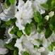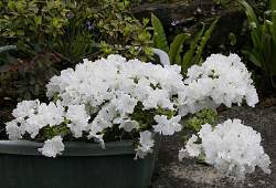 Азалия японская Panda (Панда). Очень густой низкий куст продолговатой формы. Стелется по земле. Выше 25 см не вырастает, зато хорошо разрастается в ширину. Цветки белые, распускаются в конце мая. Цветение настолько обильное, что кустарник похож на сугроб. Зимостойкость высокая.