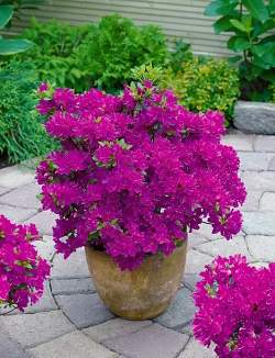 Азалия Purpurtraum (Пурпуртраум). Цветки диаметром 3 см, от фиолетовых до фиолетово-красных, не увядающие на солнце, многочисленные, собраны по 3-4 на концах побегов. Цветение в июне, очень обильное, за цветками не видно листьев. Куст плотный подушковидный, к 10-ти годам высота 50-60 см и ширина 60-80 см. Листва тёмно-зелёная глянцевая с верхней стороны, сохраняется зимой. Место полутенистое или солнечное. Предпочитает кислую, гумусную и умеренно влажную почву.