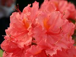 Азалия Sarina (Сарина). Цветки крупные, розово-лососевые с оранжево-золотистыми пятнышками. Обильное цветение. Морозостойкий сорт, до -27 °С.