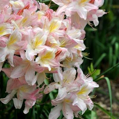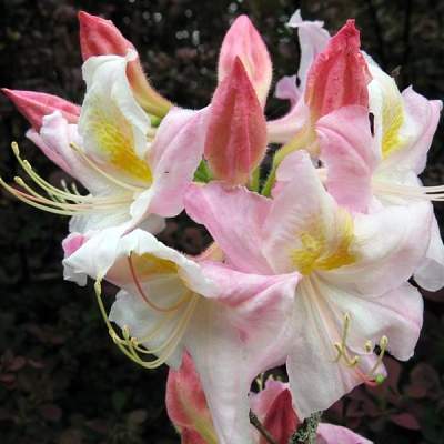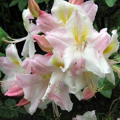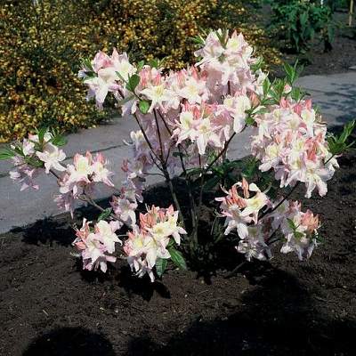 Азалия Sylphides (Сильфидес). Настоящая Снежная Королева — одна из самых морозостойких азалий! Из ярких карминно-розовых бутонов появляются хрупкие снежно-розовые остроконечные цветки с позолоченным пятнышком на верхнем лепестке. Диаметр цветка 6 см. Многочисленные пышные соцветия из 14 цветков густо покрывают компактный куст с блестящими зелёными плотными листьями.