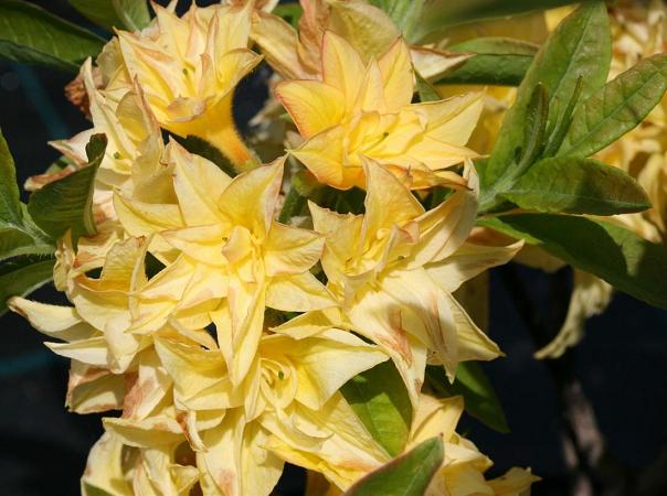 Азалию Yellow Pom Pom (Йеллоу Пом-Пом). Куст достаточно компактный, около 100 см в высоту, хорошо разветвленный. Соцветия состоят из крупных (6 см) махровых цветков. Окраска желтая, броская, лепестки заостренные, соцветия крупные, по 10 и более цветков. Цветет продолжительно, более трех недель, обильно.