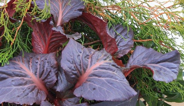 Бадан Magic Giant (Мэджик Джайнт). Листья крупные, фактурые, с глубокими выразительными прожилками. В холодное время года (осень-весна) пурпурные. Летом зеленые. Соцветия крупные, состоят из множества темно-розовых цветков. Высота растения около 50 см. Весной этот бадан особенно красив, когда розовые соцветия контрастируют с пурпурными листьями.
