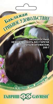 Баклажан Грибное удовольствие. Фаршированные баклажаны — королевское угощение, а что может быть лучше для этих целей, чем небольшие порционные грушевидные плоды с нежной, абсолютно негорькой мякотью и ароматом грибов. Сорт среднеспелый, первый урожай убирают через 110-145 дней после появления всходов. Растение полураскидистое, низкорослое, высотой 0,6-0,7 м для пленочных укрытый и теплиц. Плоды черно-фиолетовые, с нежной кожицей, массой 112-200 г. Посев на рассаду проводят в конце февраля. Пикировка — в фазе семядолей. Высадка рассады — конец мая. Формировка: удаление всех боковых побегов и листьев до первой развилки. На растении оставляют 5-6 самых крупных завязей, другие цветы и завязи удаляют. Схема посадки: 40х60 см.