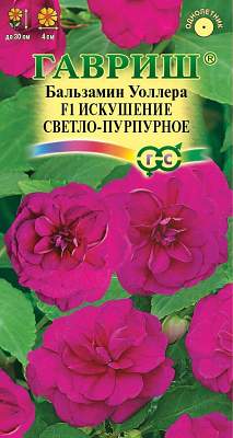 Бальзамин Искушение светло-пурпурное F1 ( Уоллера). Однолетнее растение. Куст шаровидной формы высотой до 30 см и диаметром 10-15 см. Листья темно-зеленые. Растение усыпано крупными, диаметром 4 см, махровыми цветами светло-пурпурной окраски. Цветет с июня до заморозков. Растение неприхотливое. Хорошо растет в полутени. Предпочитает легкие плодородные почвы. Достаточно влаголюбиво, но не переносит избыточного переувлажнения. Размножают семенами, посев которых производят в марте-апреле в рассадные ящики. Посевы засыпают влажным песком слоем 3 мм и поддерживают постоянную влажность, для чего емкость накрывают стеклом и ставят в хорошо освещенное место. Всходы появляются через 14-20 дней. После появления всходов, влажность субстрата и воздуха необходимо уменьшить, сняв покровное стекло. Сеянцы, достигнув высоты 1 см, пикируют в горшки по одному растению. На открытый балкон растения выставляют в середине мая. Используют для украшения контейнеров, висячих корзин и клумб, можно выращивать, как комнатное растение.
