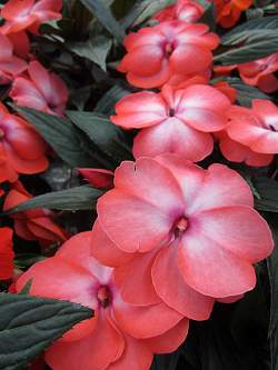 Бальзамин новогвинейский коралловый (1 л). Великолепное сезонное украшение сада. Может расти в тени и при этом обильно цвести. Цветки крупные, до 6 см, обильно покрывают компактный кустик с темно-зелеными вытянутыми листьями. Осенью растение можно забрать домой и содержать как комнатное растение.