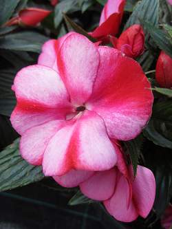 Бальзамин красно-сиреневый (1 л). Великолепное сезонное украшение сада. Может расти в тени и при этом обильно цвести. Цветки крупные, до 6 см, обильно покрывают компактный кустик с темно-зелеными вытянутыми листьями. Осенью растение можно забрать домой и содержать как комнатное растение.